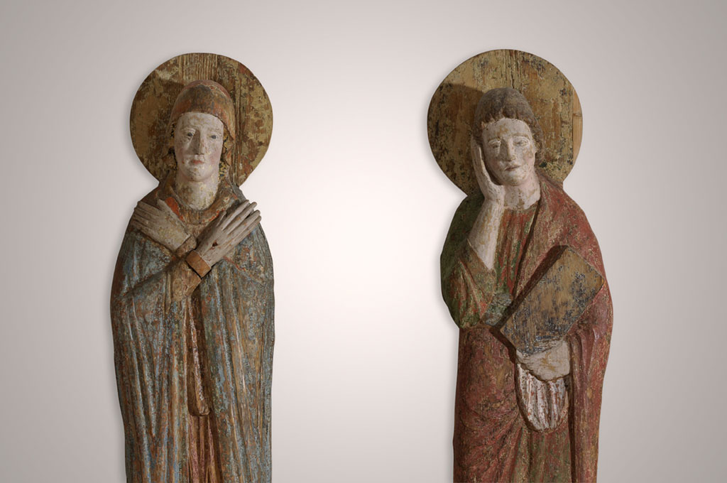 Älteste und bedeutendste Objekte in der Kunstabteilung des Kelnhof-Museums sind die Lindenholzskulpturen von Maria und Johannes aus der Zeit um 1225. Sie sind Teil einer Kreuzigungsgruppe aus der Bräunlinger St. Remigiuskirche und werden mit dem Kloster Reichenau, das hier Besitz hatte, in Verbindung gebracht. Demnach entstanden sie vermutlich auch im Umkreis des Inselklosters. Die flachen Figuren mit den Resten alter, farbiger Fassung haben einen berührend innigen, schlichten Ausdruck. Die unter dem Kreuz trauernde Mutter Jesu weist mit der einen Hand auf das (nicht erhaltene) Kreuz. Der Apostel Johannes hat in einer uralten Gebärde der Trauer eine Hand an seine Wange gelegt.